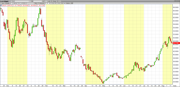 Domestic crack spreads for ULSD recently hit $50.00 a barrel, a gross refining margin not seen since winter. Gasoline margins are also strong. RBOB crack spreads are trading around $40.00. Fall turnaround is right around the corner, which will reduce refinery output. PADD 1 distillate and gasoline stocks are well below the 5-year average. Planned turnarounds at Irving’s St. John and Monroe Energy’s Trainer refineries, both important to East Coast supply, have the potential to support prices on the NYMEX.